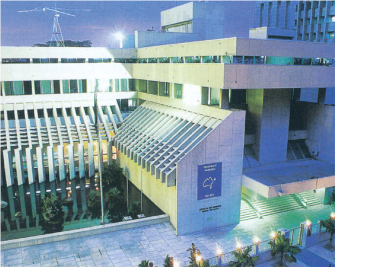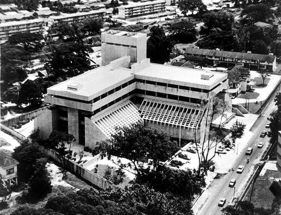 Australian architects Bernard Joyce and William Nankivell of Joyce Nankivell Associates were commissioned to design the building with Malaysian architecture firm Leong Thian Dan Rakan-rakan. They proposed a bold design in the Brutalist style. The ‘L’ shape plan with a lift and service tower at the junction of the wings successfully combined the dual obligations of high security and public access. |